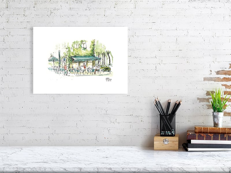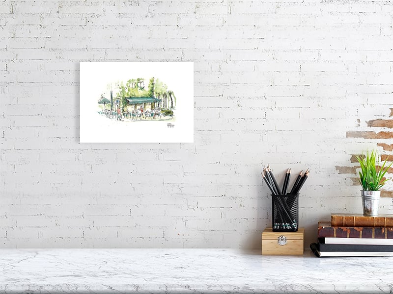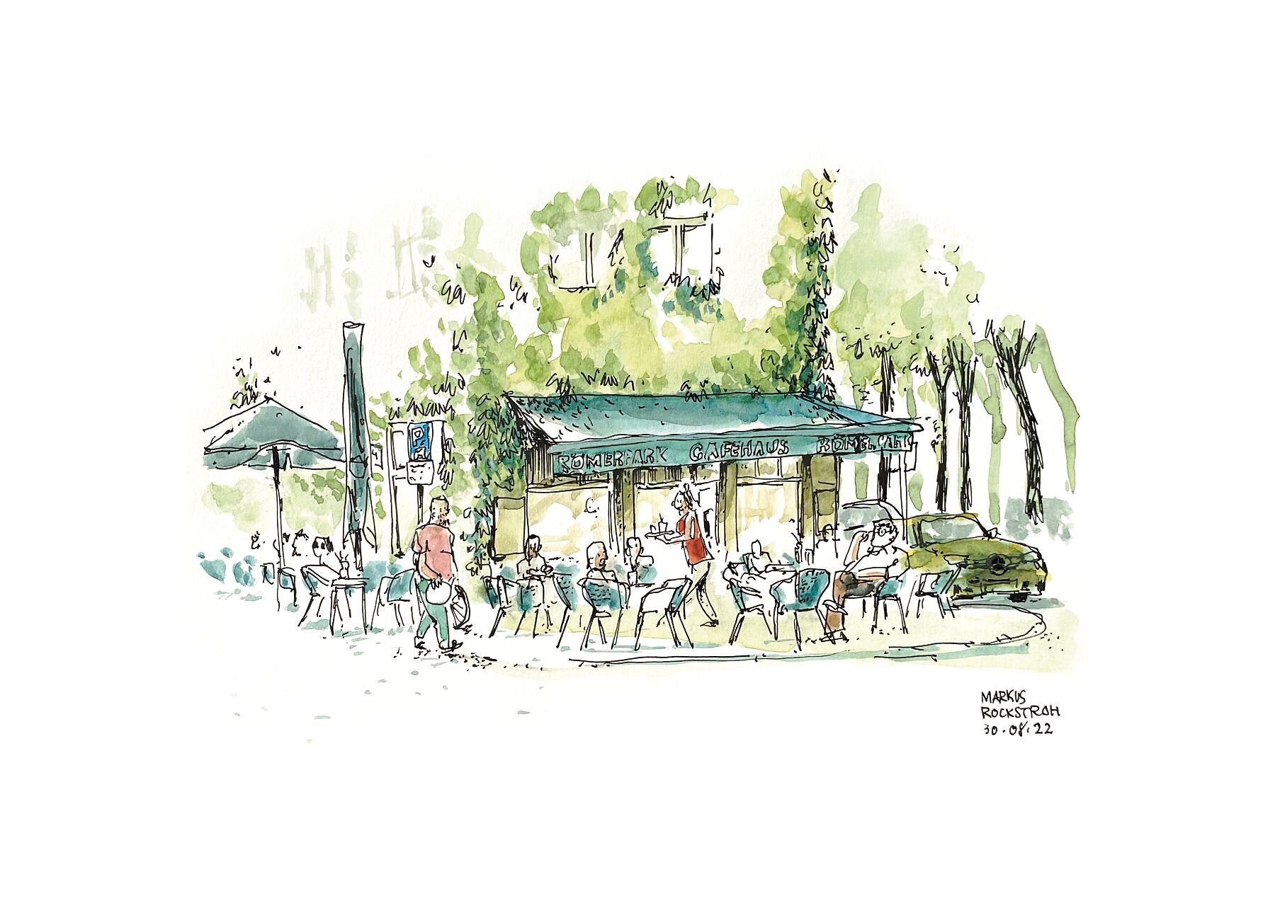 Mit Fineliner und Aquarell spazierte ich durch mein Veedel in Richtung Eierplätzchen. Ich setzte mich und malte das Café Römerpark. Sonnenschein in der grünen Südstadt.